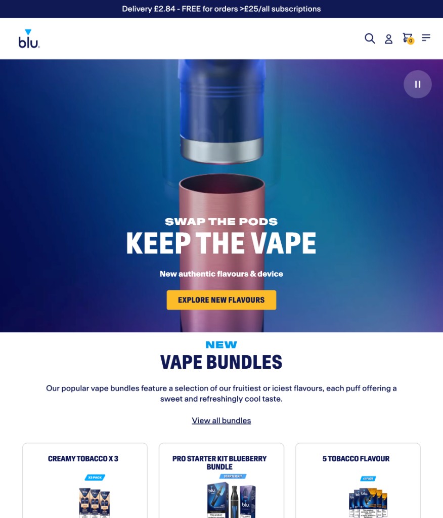 blu.com — hero with pod device, SWAP THE PODS / KEEP THE VAPE messaging, and VAPE BUNDLES section